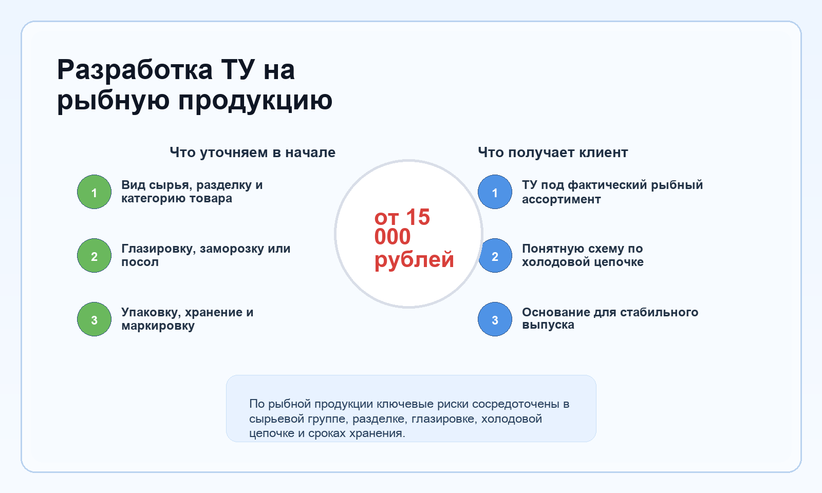 На выходе заказчик получает не общий пищевой текст, а рабочую редакцию под реальную рыбную линейку. Это особенно важно там, где в одном бизнесе одновременно есть замороженные позиции, соленая рыба, филе в глазури и другие SKU с разной логикой обращения.